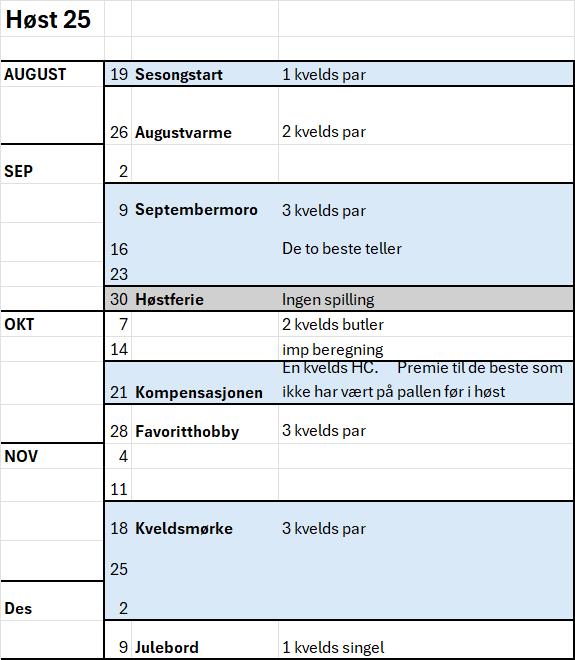 7.-14. oktober : Impen To kvelds turnering med butler-beregning.